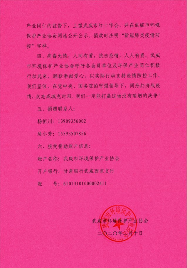 武威市環(huán)境保護(hù)產(chǎn)業(yè)協(xié)會(huì)抗擊新冠肺炎獻(xiàn)愛(ài)心倡議書(shū)