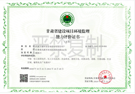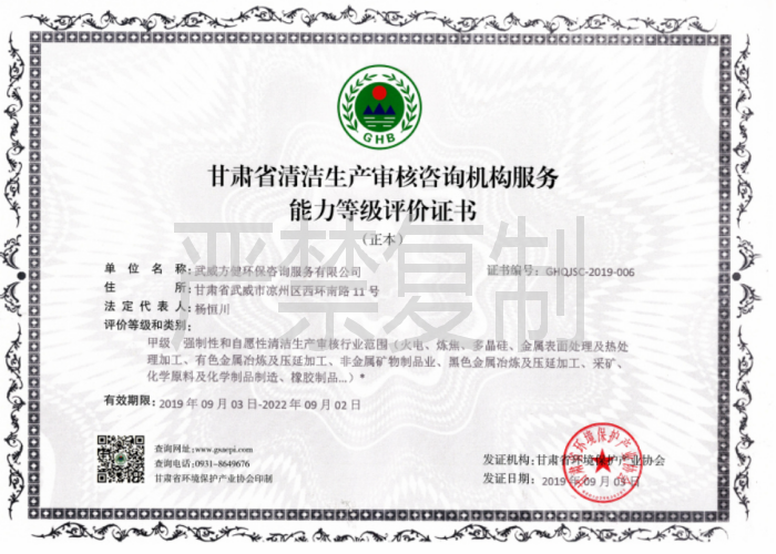 《甘肅省清潔生產(chǎn)審核咨詢機(jī)構(gòu)服務(wù)能力評(píng)價(jià)證書》甲級(jí),(證書編號(hào):GHQJSC-2019-006號(hào))、《甘肅省建設(shè)項(xiàng)目環(huán)境監(jiān)理能力評(píng)價(jià)證書》(GHJ-2019-004號(hào))、《甘肅省環(huán)境污染治理工程服務(wù)能力評(píng)價(jià)證書》甲級(jí)(證書編號(hào)GHGC-2020-021)。